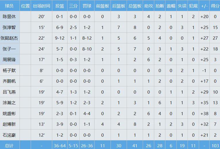 中国男篮12人全部披挂上阵,其中5人得分上双,(13号)张懿赵杰22分钟轰下27分外加6板5助4断,(11号)张淳智15分8板2断,(14号)张子一18分7板3断,(12号)吕飞燕10分,(9号)涂瀚之13分3板1助6断。